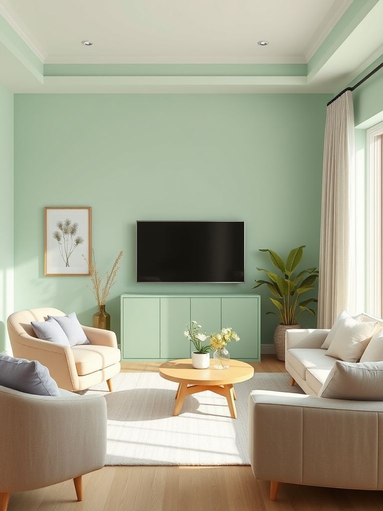 Image Prompt: Spring 2025 pastel-themed living room with mint green walls, pale peach armchair, lavender cushions, natural wood coffee table, linen curtains, Unreal Engine 5, 4K ultra-resolution, 16:9.