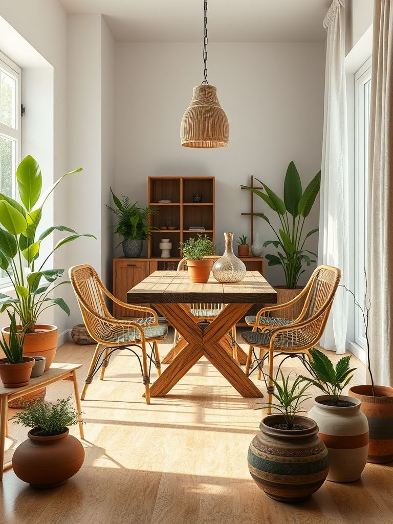 Natural textures bring warmth and authenticity. A reclaimed wood dining table paired with bamboo chairs creates a rustic yet modern setting. Cork flooring adds softness underfoot while also being durable and sustainable. Even smaller details like clay pots or woven baskets contribute to this earthy theme.