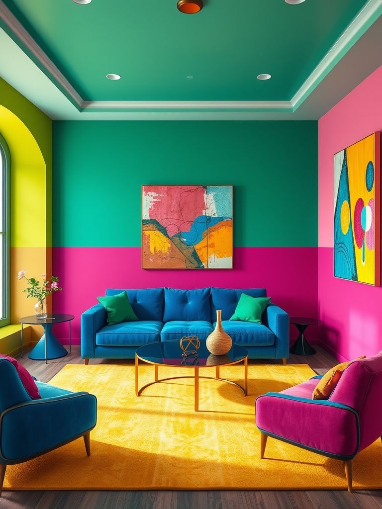 Walls, furniture, and even flooring are being used as canvases for this trend. Painting one wall in a bold shade and another in a contrasting color creates dynamic energy. Similarly, mixing brightly colored sofas with equally bold rugs makes the space lively and expressive.